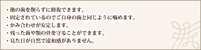 ・固定式でしっかり噛める ・着脱の煩わしさがない ・高い審美性 ・他の歯に負担をかけない ことにより残っている歯を 守ることが出来る ・噛みあわせが安定する ・歯を削らずに修復可能 |