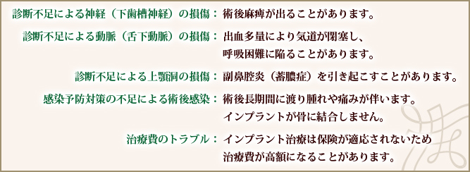 インプラント治療には様々なメリットがありますが、以下のことに注意が必要です。