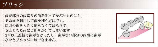 | メリット | ・保険適応なので経済的 ※一部保険適応外 ・固定式で修復でき違和感が 少ない ・ある程度しっかり噛める ・短期間で修復可能 |