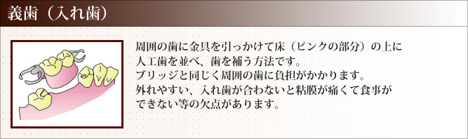 ・取り外しが億劫 ・金具が見えると見た目が悪い ・入れ歯が揺れやすく、 粘膜に食い込んで痛みが 出ることがある ・噛みにくい ・支えとなる歯に多大な負担が かかる事により寿命を縮めて しまう事がある |