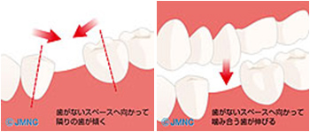 残っている歯は、歯がない部分に倒れこみ、かみ合わせを崩します。