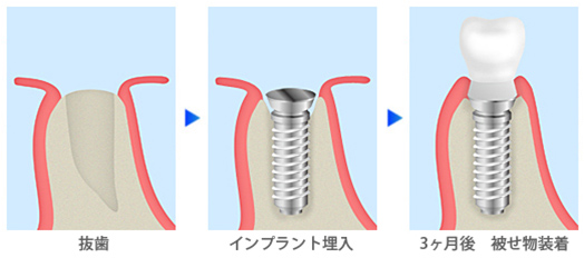 「歯を抜く→歯ぐきの治癒を待つ(治癒期間:3か月〜6か月)→人工歯根を埋入する」